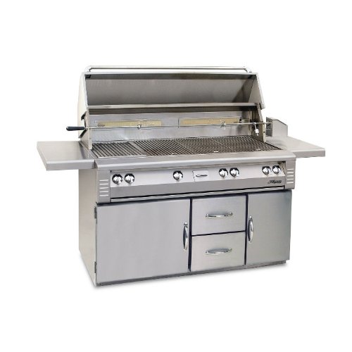 56" Standard All Grill, Three High Temp Stainless Steel Burners, Rotisserie Heavy Duty Motor, 15,000 BTU Infrared Burner, Smoker with Oversized Wood Chunk Drawer, 998 Sq. In. of Grilling Area, and a Pushbutton Ignition with Sealed 9v Power Source (Cart Sold Separately)